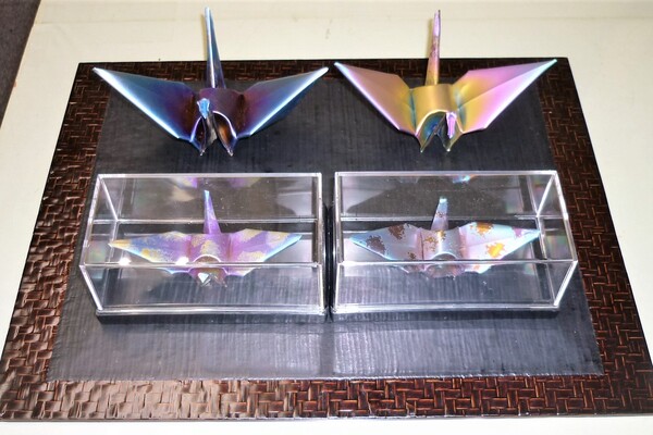 ナカタ工業では、建築板金の技術を活かし、手作りの金属折り鶴の販売も行っています。